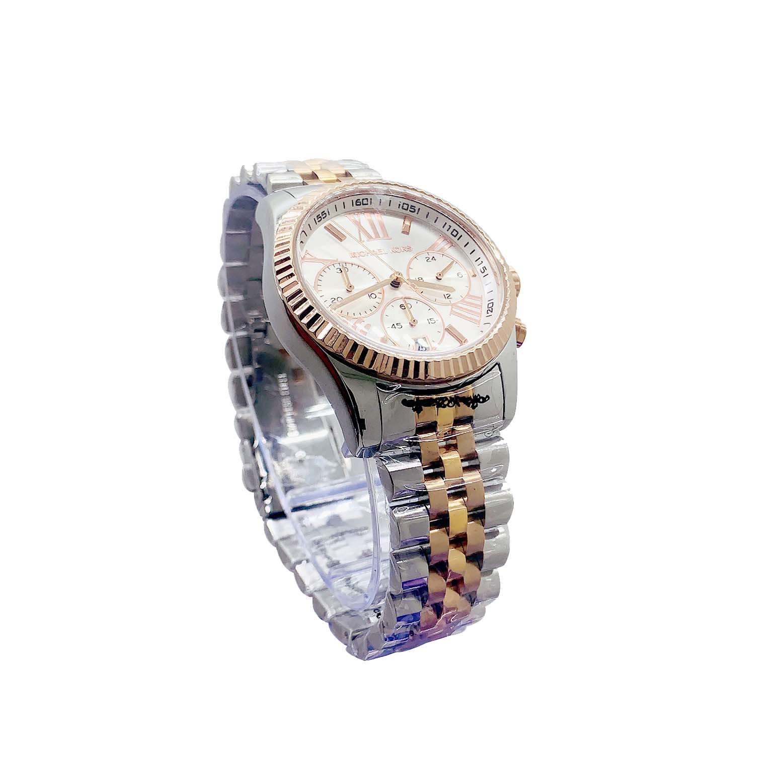 The Michael Kors Lexington MK5735 is a tri-tone (silver, gold, rose gold) stainless steel chronograph watch featuring a 38mm case, analog display with date, quartz movement, mineral crystal, and 100m water resistance, with a deployment clasp and a silver dial with rose gold accents