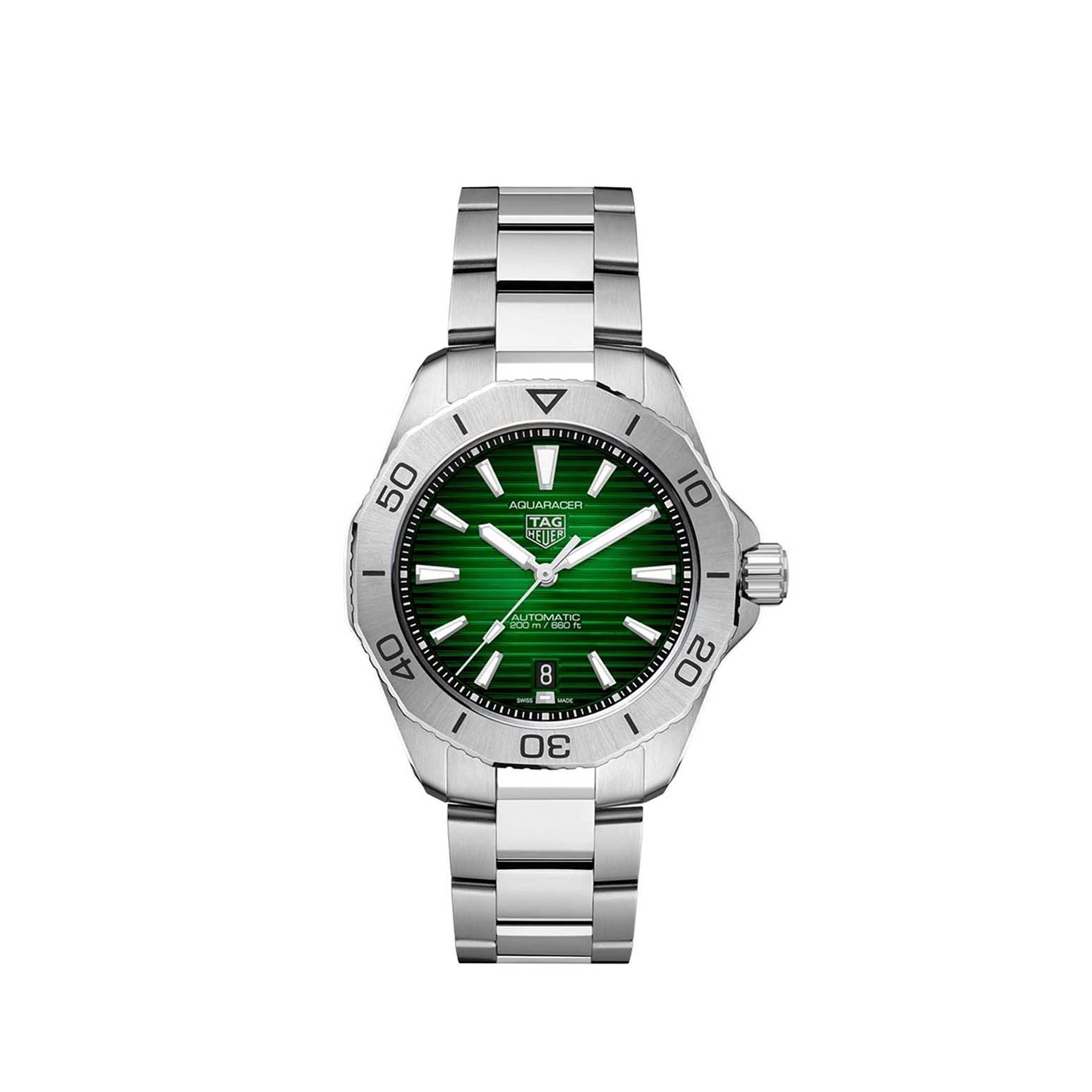 The TAG Heuer Aquaracer Professional 200 is a versatile 40mm sports watch with 200m water resistance, available in quartz or automatic (Calibre 5/Solargraph), featuring a brushed steel case, unidirectional turning bezel, date function (on some), and a three-link bracelet with polished center links, designed for urban wear with a dressier touch